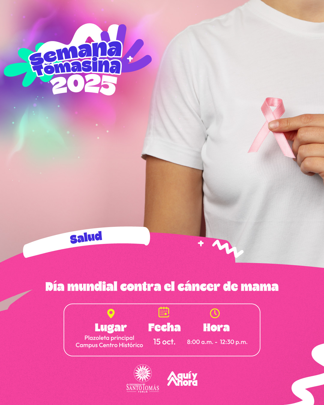 This event has passed. Ver Todos Los Eventos Día mundial contra el cáncer de mama octubre 15 @ 8:00 am - 12:30 pm Event Navigation « Celebración Día Mundial de Salud Mental Concurso de Puentes » Detalles Fecha: octubre 15 Hora: 8:00 am - 12:30 pm Categoría del Evento: Cultural, Miércoles Lugar Plazoleta Central – Campus Centro Histórico Organizador Departamento de Promoción y Bienestar Institucional. + Google Calendar+ iCal Export Anterior Celebración Día Mundial de Salud Mental Siguiente Concurso de Puentes